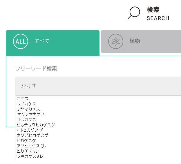 検索窓に2字以上を入力すると和名、科名、学名の候補が出ます。
