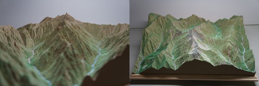 2万5000分の1地形図の等高線情報を忠実に原寸表現した高さ1.4倍、迫力の立体模型