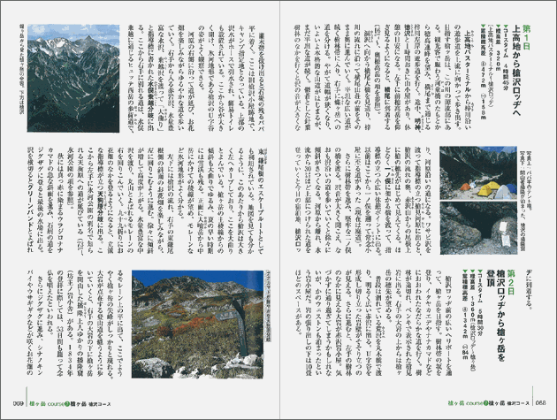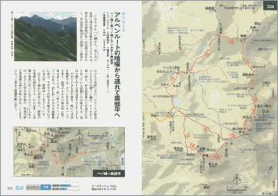 また、各コースごとに道の断面を示した高低図を掲載。これによって、登山行程の登り下りの傾向がイメージできるようになり、他のルートとの比較が、視覚的にとらえられるようになっています。