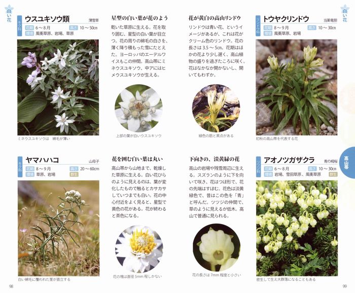 高山帯の風景/高山帯ってどんなところ?/赤や青の花/黄色い花/白い花/高山に咲く希少な花/樹木/木の実と紅葉/蝶とトンボ/野鳥/ワシ・タカ/地衣類