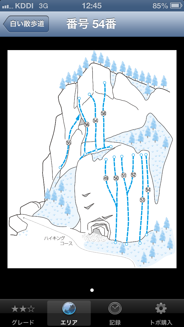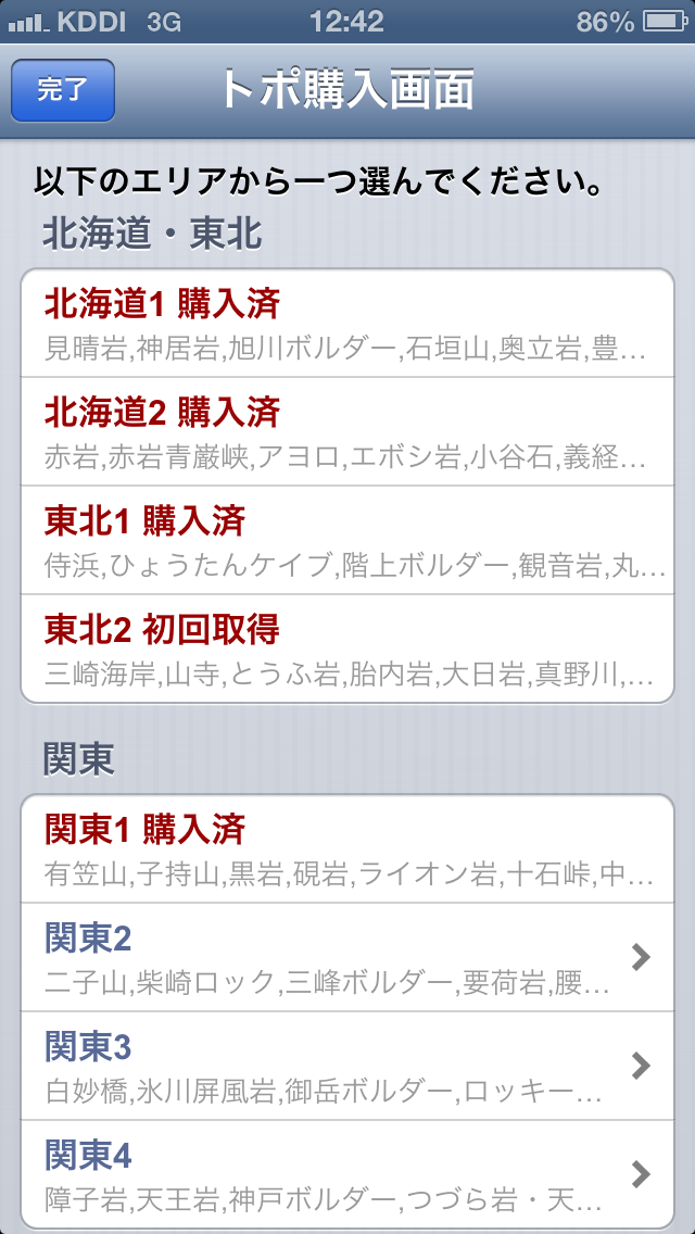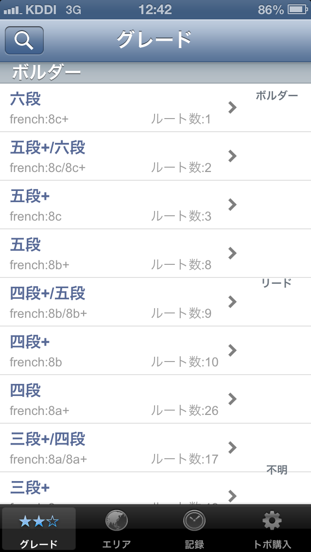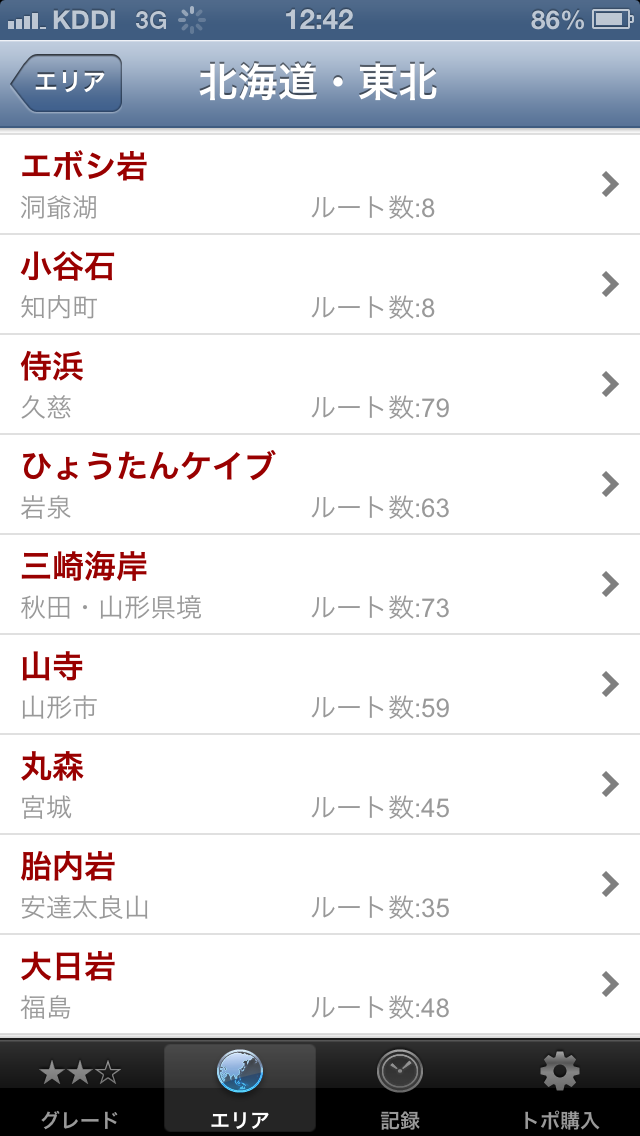アプリ用に用意されたトポデータは地域別に分かれ、必要なエリアだけを購入できるのが魅力。また、検索性に優れ、選択したグレードのみを全国の岩場から抜き出してリスト化することもできます。