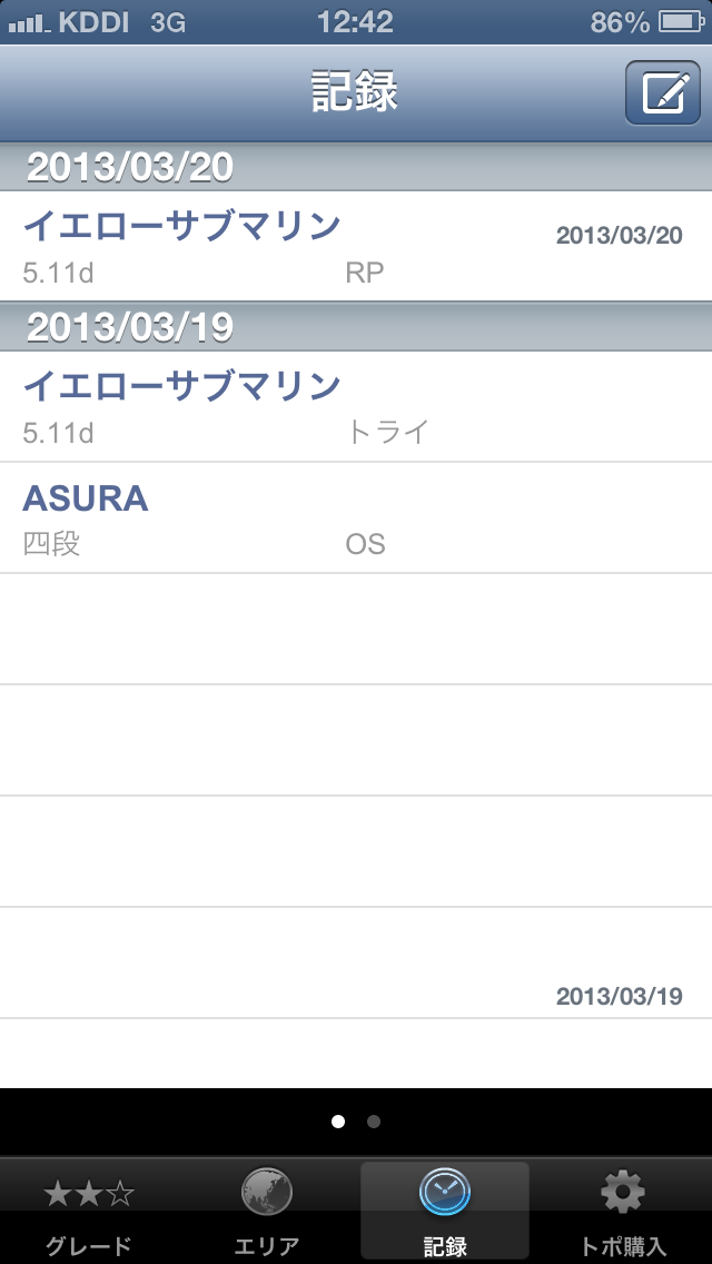 自分の記録は、「トライ中」「レッドポイント」「オンサイト」などと詳細に残せ、これまで本に直接書き込んだり、表計算ソフトなどでリストを管理したりしていたクライマーには便利な機能となっています。加えて、登った結果をtwitter、facebookに投稿でき、情報の共有にも役立ちます。熱心なクライマーには待望のアプリです。