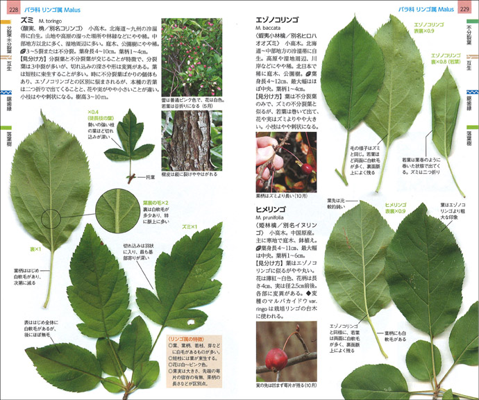 見分けにくい類似種を見開きに並べ、違いを解説。徒長枝の葉、