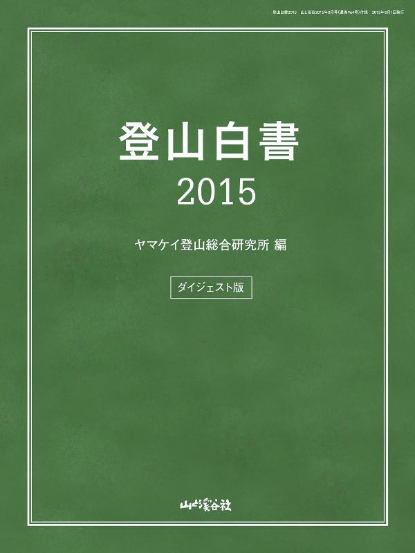 「登山白書 2015 ダイジェスト版」は、2015年4月に設立されたヤマケイ登山総合研究所が編集、刊行するものです。同研究所は2016年7月から年度版『登山白書』の刊行をスタートいたしますが、それに先駆けて月刊『山と溪谷』誌の特別付録のスタイルで「ダイジェスト版」を刊行いたしました。