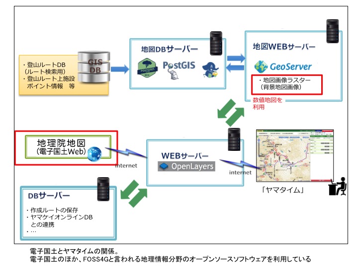 システム全体の背景基図ベースとして地理院地図(インターネット環境)を使用。①のヤマケイ基図に対応していないエリア(主要山岳エリア外)について、ユーザは地理院地図を参照します。