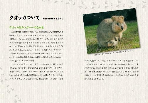 本書には、合計45点もの可愛らしいクオッカの写真を用いて、ジャンプするクオッカ、背伸びするクオッカ、子育てするクオッカ、カメラ目線のクオッカ、仲間と会話をしているようなクオッカなど、さまざまなクオッカを収めました。巻末には元上野動物園園長による、クオッカの解説文も掲載しています。