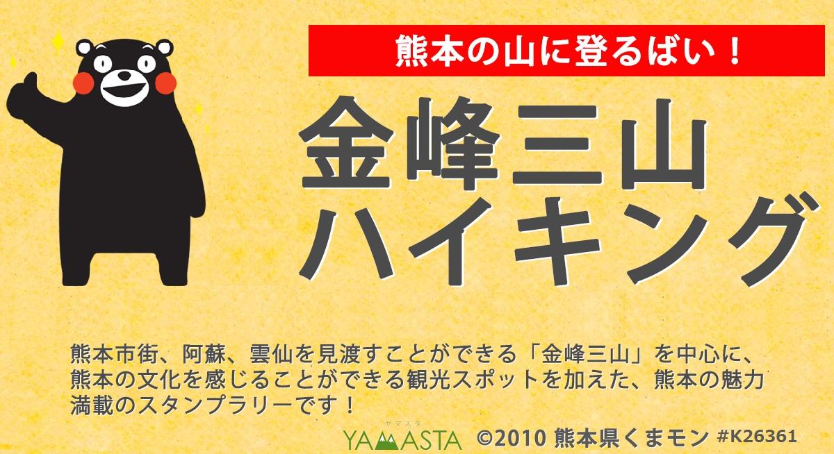 「金峰三山ハイキングスタンプラリー」は、登山者やハイカーに熊本県の山の魅力を知っていただくとともに、実際に熊本の山に足を運んでもらうことで熊本県の復興を応援することを目的として実施するものです。熊本市街、阿蘇、雲仙を見渡すことができる「金峰三山」を中心に、熊本の文化を感じる観光スポットを巡るハイキングコースです。