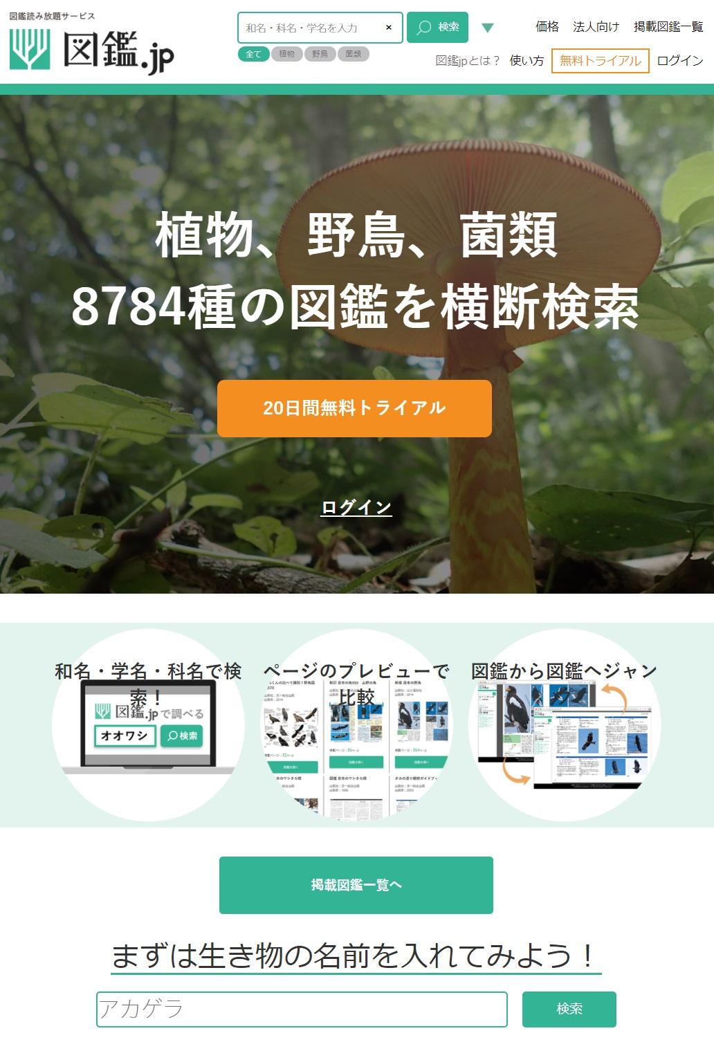 主に中・上級者の愛好家向けの生物図鑑類を電子書籍化して、ジャンルごとに読み放題とする継続課金制のウェブサービス。現在、「植物」「野鳥」「菌類」の3各ジャンルを提供中で、出版社のほか博物館やNPO法人を含む6社2機関の専門性の高い生物図鑑を提供しています。それらの図鑑群を和名、学名、科名で横断検索できるほか、図鑑についての追補や種についてのコラム、ユーザが種について投稿したものを図鑑とともに検索できるなどの独自の機能を持ったジャンル特化型のプラットフォームです。