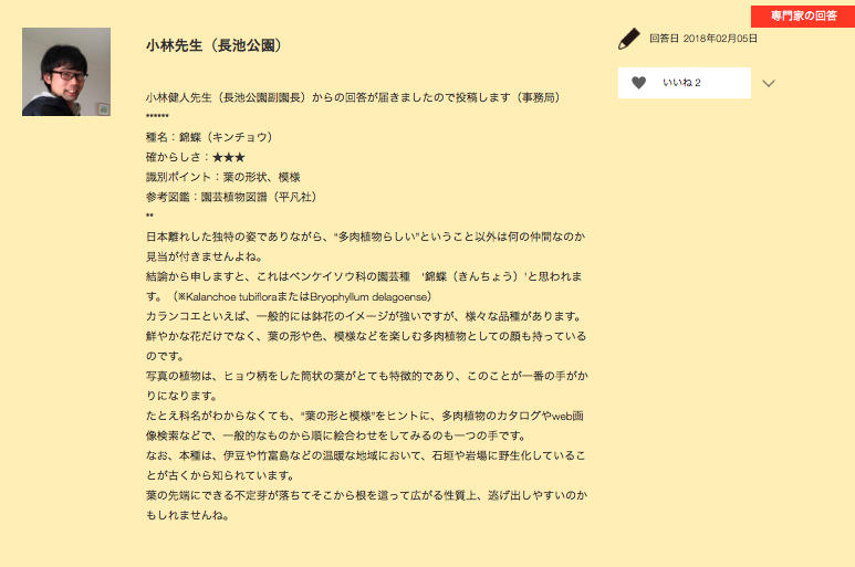 2017年秋には、本コーナーで「ぜんぶ答えますキャンペーン」として、専門家の先生方にユーザからの質問に答えていただくキャンペーンを展開。単に生き物の名前を答えるだけではなく、そのことも含んで植物や野鳥の見方、図鑑の使い方まで学ぶことができる回答が大好評でした。そこで、この2月中旬から、その専門家の方々に回答者として常駐していただき、一部の質問にご回答いただくことになりました。