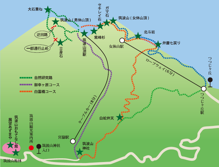 筑波山おもてなし館、展望あずまや、筑波山神社、筑波山頂駅、立身石、大石重ね、紫峰杉、ガマ石、筑波山(女体山頂、男体山頂)