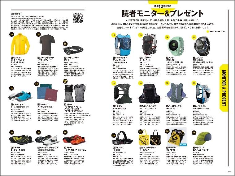 2014年の創刊以来、マウンテンスポーツマガジン『トレイルラン』は今号で通巻10号となります。そこで、読者の皆さまに感謝の意を表して、読者モニター&プレゼントを企画しました。モニター商品は多機能GPSウォッチとバックパック、プレゼントはシューズやウェア、小物をとり揃えました。