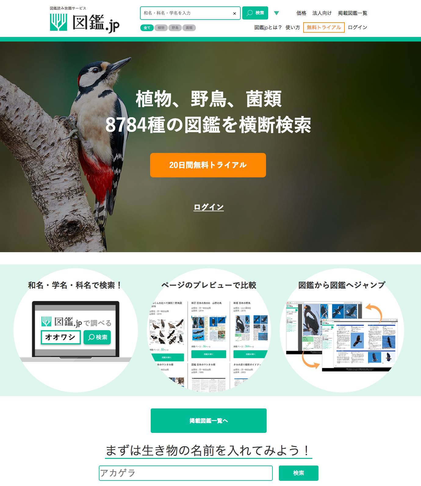 図鑑.jpは、主に中・上級者の愛好家向けの生物図鑑類を電子書籍化して、ジャンルごとに読み放題とする継続課金制のウェブサービスです。現在、「植物」「野鳥」「菌類」の3各ジャンルを提供中で、出版社のほか博物館やNPO法人を含む6社2機関の専門性の高い生物図鑑を提供しています。