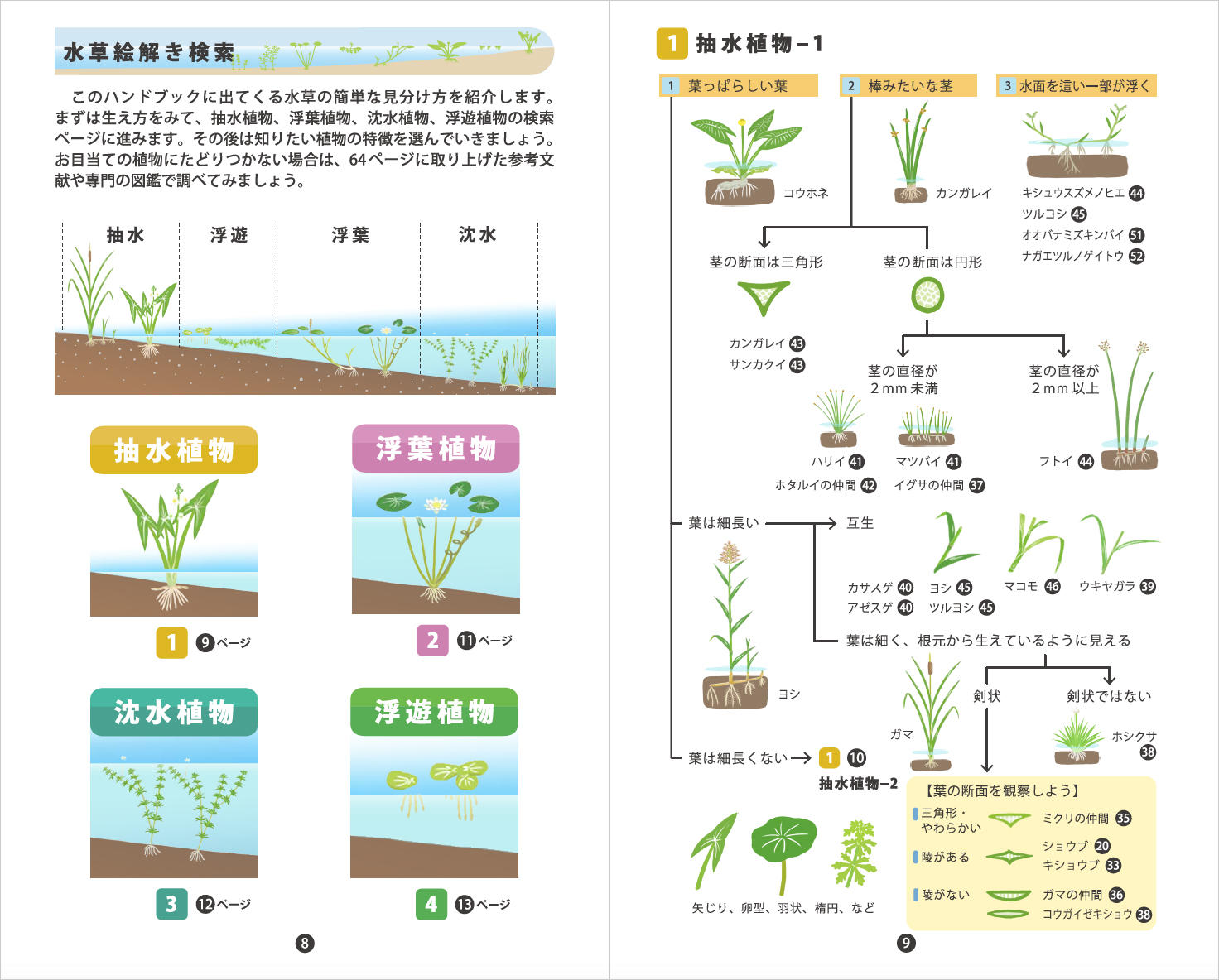 『水草ハンドブック』(新潟大学教育学部)には、主に関東から西日本で見られる代表的な水草133種が紹介されています。熟練した水草観察者である著者陣の丁寧な解説に加え、水辺で比較的よく見かける種類に絞って掲載されているため、上位の専門図鑑を使いこなせない初心者の方でも、簡単・気軽に水草の名前を調べることができます。図鑑.jpには、すでに『日本水草図鑑』(文一総合出版)と『ネイチャーガイド 日本の水草』(文一総合出版)の2冊の専門図鑑が掲載されていますが、今回の『水草ハンドブック』の追加によって、水草の名前がより調べやすくなりました。たとえば、『水草ハンドブック』で科や属の検討をつけてから、必要に応じて専門図鑑で近縁の仲間を調べるといった横断検索も可能です。野外での観察をはじめ、水草の調査・保全・普及活動等にも大いにご活用ください。