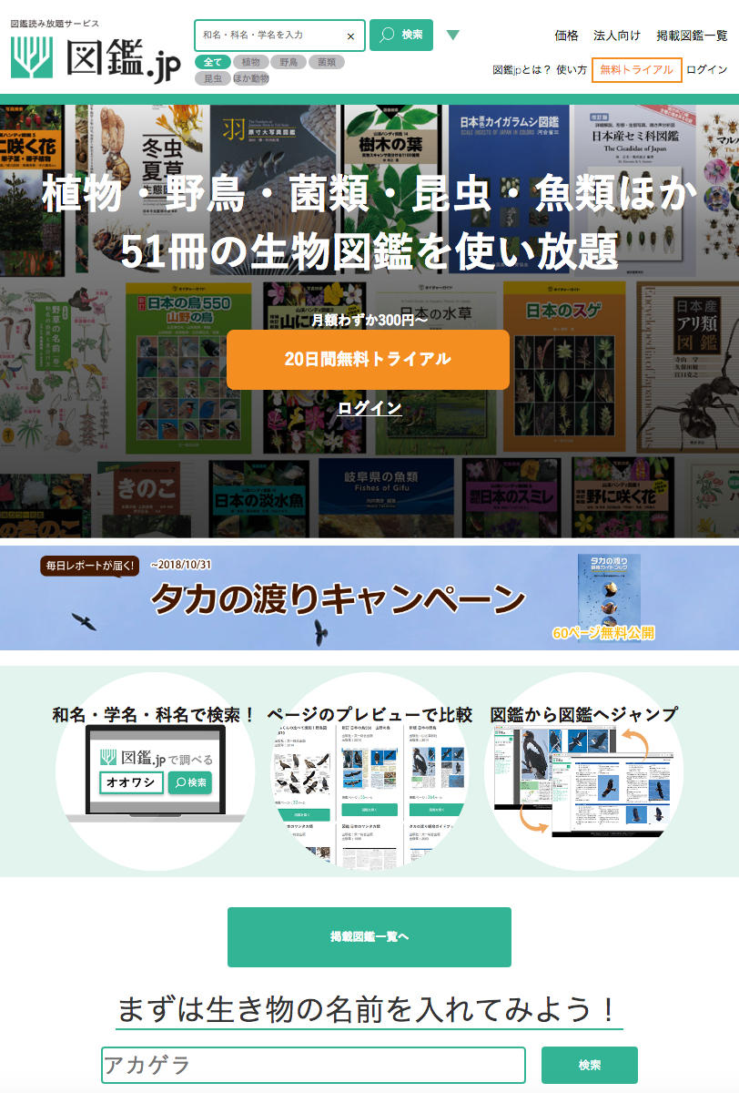 「図鑑.jp」は、複数の出版社が発行する生物図鑑を電子書籍化して、読み放題にする継続課金制(年額・月額)の会員サービスです。複数出版社が発行する図鑑を和名、学名、科名で横断検索でき、通信環境は必要ですがタブレットやスマートフォンで野外でも閲覧可能なサービスです。また、図鑑について補足する追補やコラム、ユーザがわからないことを質問したり、目撃・観察情報を報告する掲示板を設置。一部の質問については専門家が回答しています。