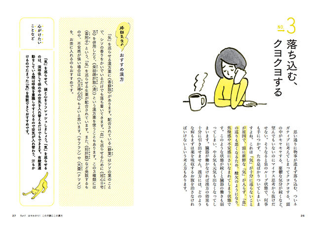 本書ではまず、鎌倉市大船にある杉本薬局の3代目・杉本格朗先生が、漢方の考え方の基本となる“気”や“陰陽五行説”などを平易な言葉で解説しています。さらに、それらの考え方をベースに、こころの不調の種類やシチュエーションにマッチした漢方薬や養生法を教えてくれます。巻末には、生薬などを使った簡単なレシピも載っています。本書を読んだすべての方の“こころ”が軽くなり、のびのびと暮らせることができたらと願っています。