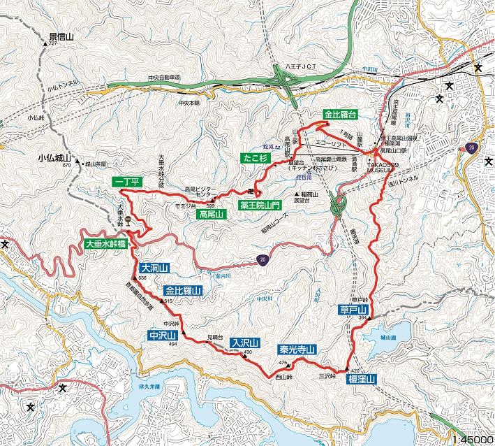 草戸山/榎窪山/泰光寺山/入沢山/中沢山/金比羅山/大洞山/大垂水峠橋/一丁平/高尾山/薬王院山門/たこ杉/金比羅台
