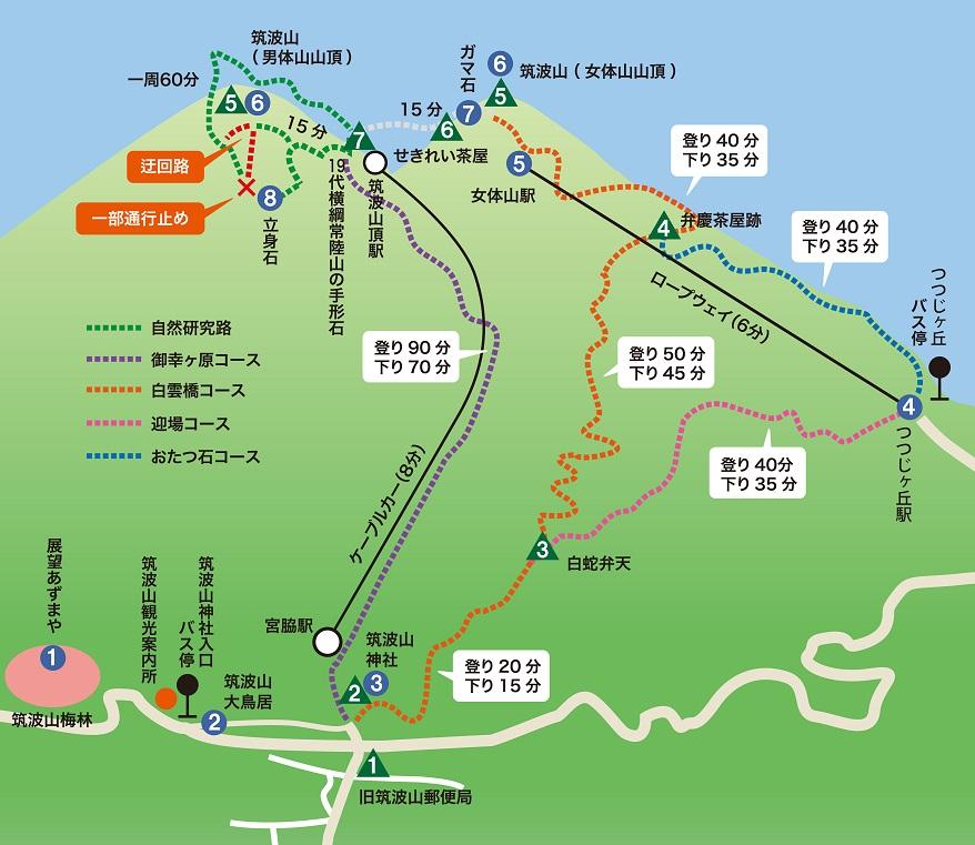 展望あずまや(筑波山梅林内)、筑波山大鳥居、筑波山神社(随神門横 宇宙の卵)、つつじヶ丘(ガマランド)、女体山駅、筑波山(女体山山頂・男体山山頂)、ガマ石、立身石