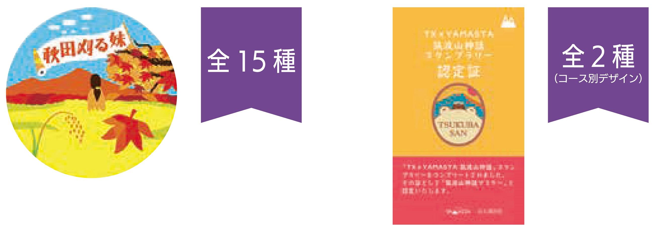いずれかのコースを達成し、獲得したトロフィーまたはスタンプを「筑波山観光案内所(営業時間:8時30分~17時15分)」で提示すると、その場で缶バッジ(先着1,000個、デザイン15種)と認定証(コース別、デザイン2種)をプレゼントします。