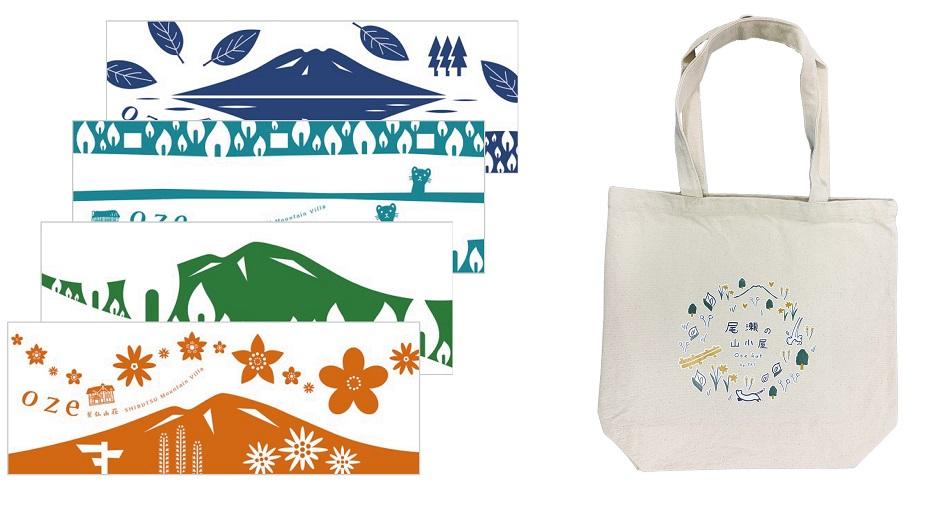 オリジナルピンズ応募者の中から、抽選で25名様に尾瀬オリジナルグッズのトートバッグや山小屋手ぬぐいをプレゼント。手ぬぐいは尾瀬の山小屋や、その周辺の景色イメージしたデザインです。(てぬぐいは4種、トートバッグは1種)
