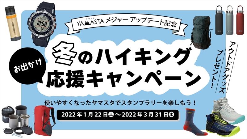また、より便利になったアプリを使ってハイキングや登山を楽しんでいただくキャンペーンとして、素敵なアウトドアグッズがもらえる「冬のハイキング お出かけ応援キャンペーン」を2022年1月22日(土)から2022年3月31日(木)まで記念開催いたします。
