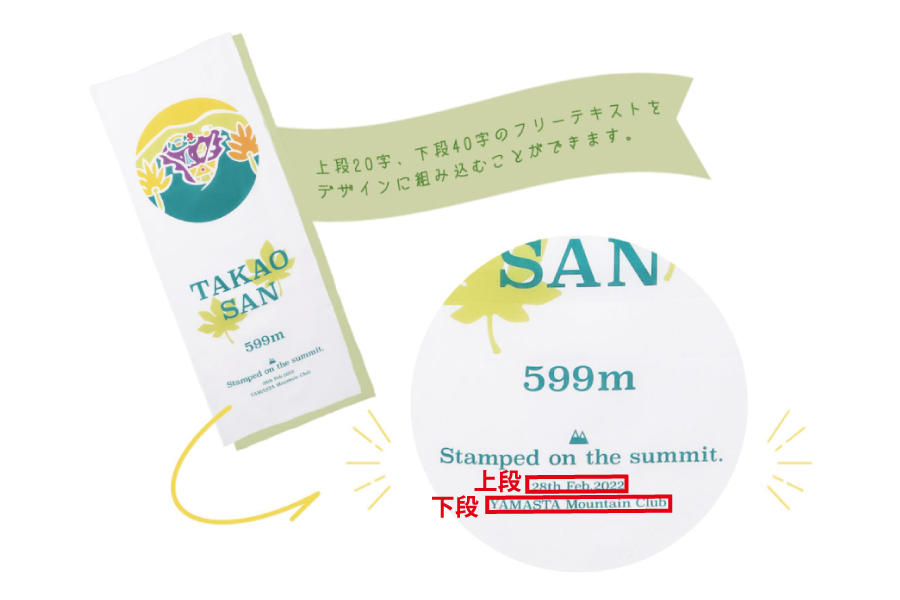 上段20字、下段40字のフリーテキストをデザインに組み込むことができ、山での思い出や登頂の喜びを込めたオリジナルの手ぬぐいを作ることができます。