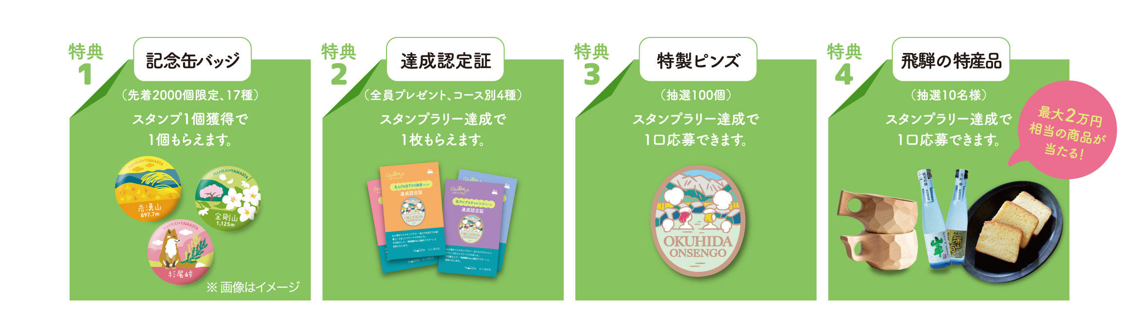 チェックインポイントでスタンプを獲得すると記念缶バッジがもらえます。さらに、各コースのスタンプラリーを達成するとコース達成認定証がもらえるほか、抽選で特製ピンズや飛騨の特産品が当たります。特典の詳細は「山と湯めぐりスタンプラリー」特設サイトをご確認ください。