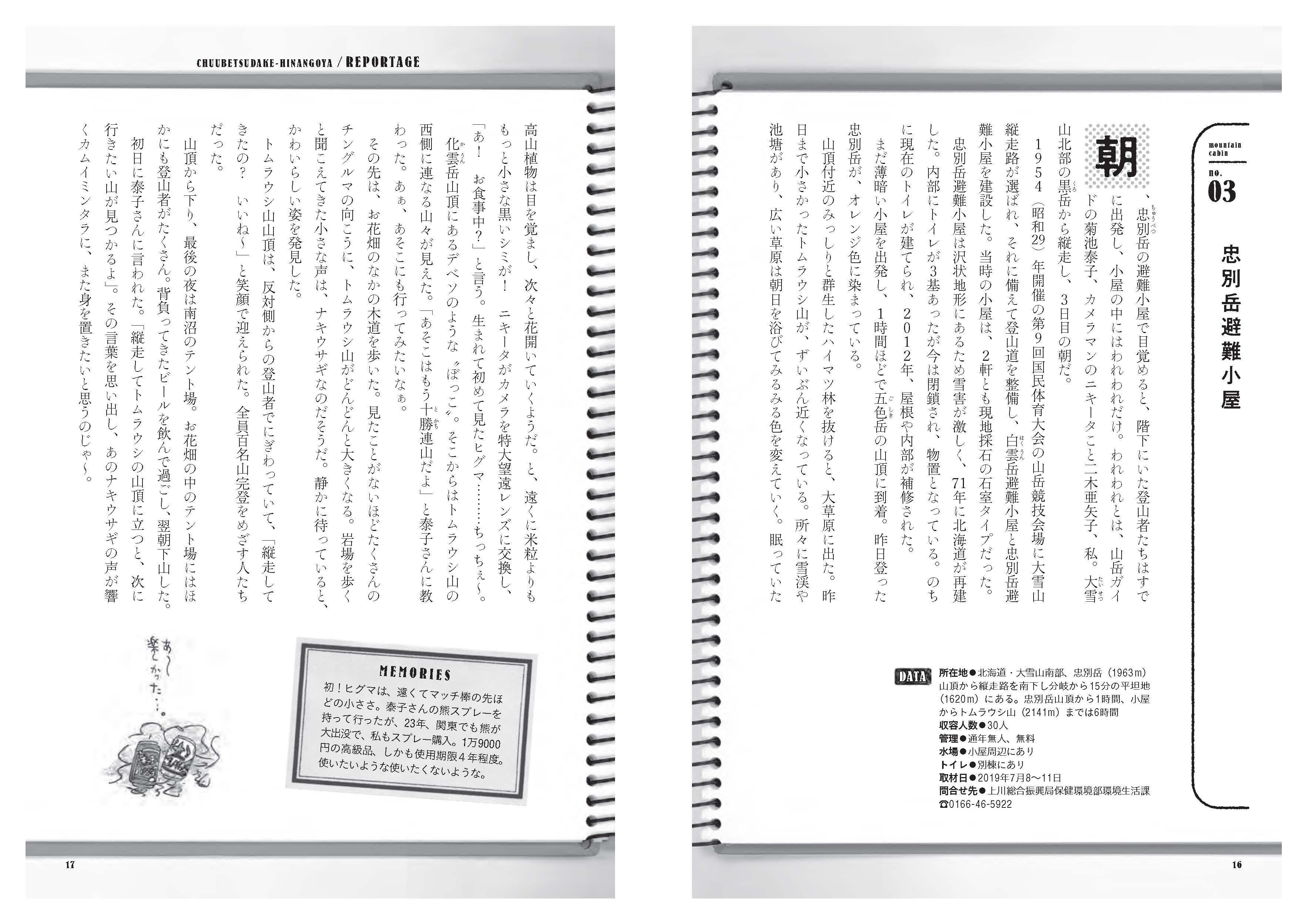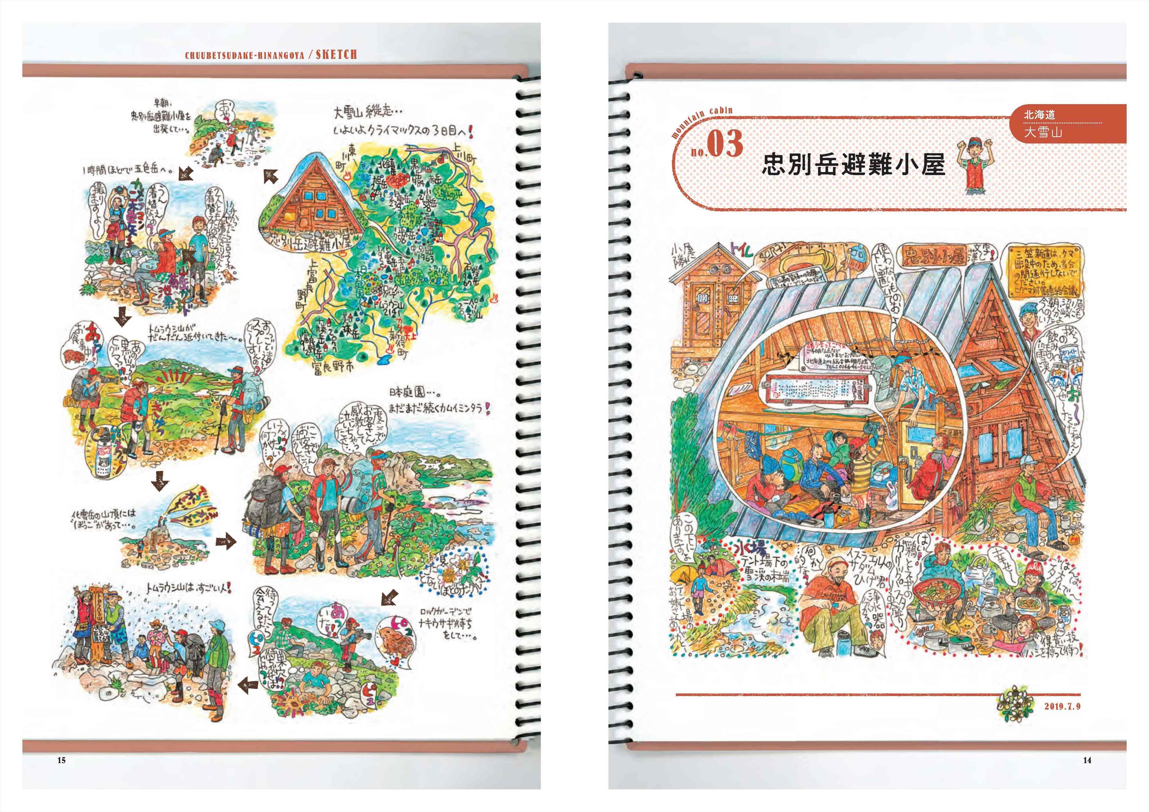 本書では、日本各地の山に300軒近くあるといわれる避難小屋の中から、著者が実際に訪れた41軒を紹介しています。写真や図面とは違い、小屋の雰囲気まで伝わる著者独自のカラーイラストで描かれた間取り図は、前作『それいけ避難小屋』から健在。山小屋を訪れる行程を描いた、躍動感あふれるイラストも見どころです。
