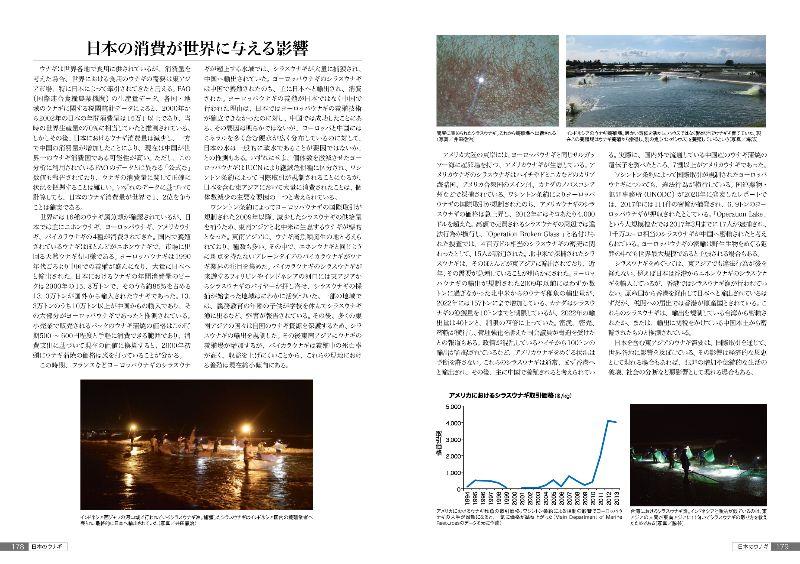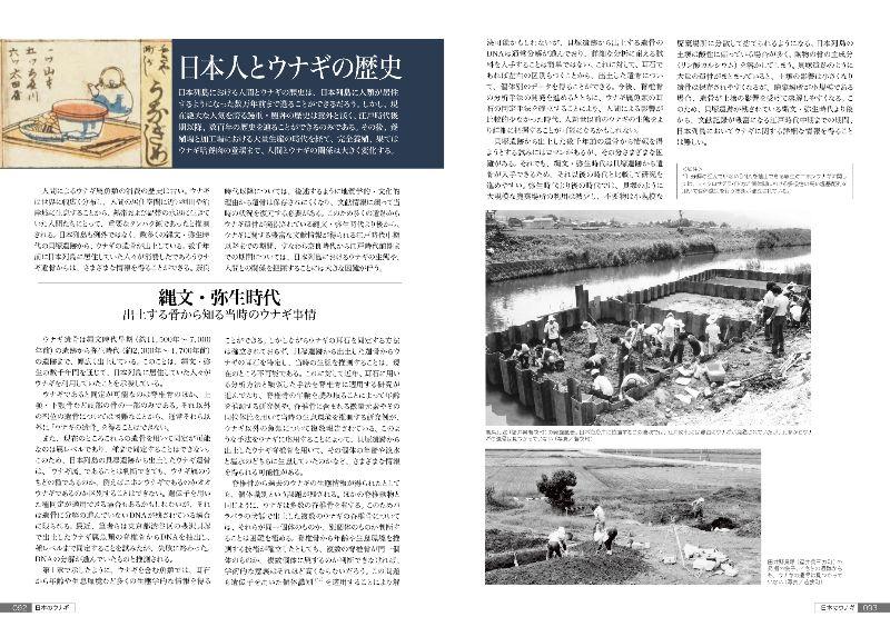 後半部では、保全生態学の専門家である海部先生による最新の知見や研究成果とともに、川や河口域でのウナギの生態をビジュアルで解説する第3章、縄文~江戸~現在まで続くウナギ文化や捕えるための漁法、そして蒲焼や鰻丼を含めたさまざまなウナギの食に関する第4章、さらに現在減少が騒がれるニホンウナギの保全に重要な日本の河川・自然環境を考える第5章と続きます。