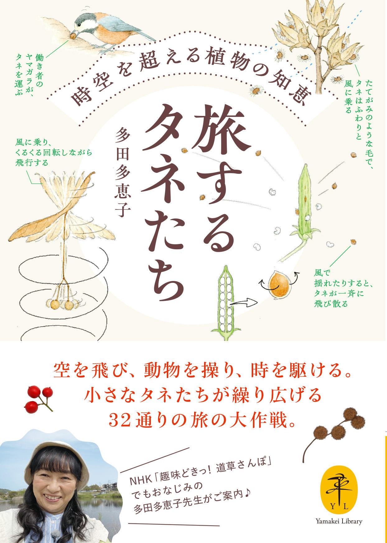 風に乗るパラシュートや翼、水に浮くコルクに自動発射装置、さらにはかぎ爪や色仕掛けで動物をヒッチハイクしたり、旅するタネたちは、驚くほど巧みな戦略を携えています。