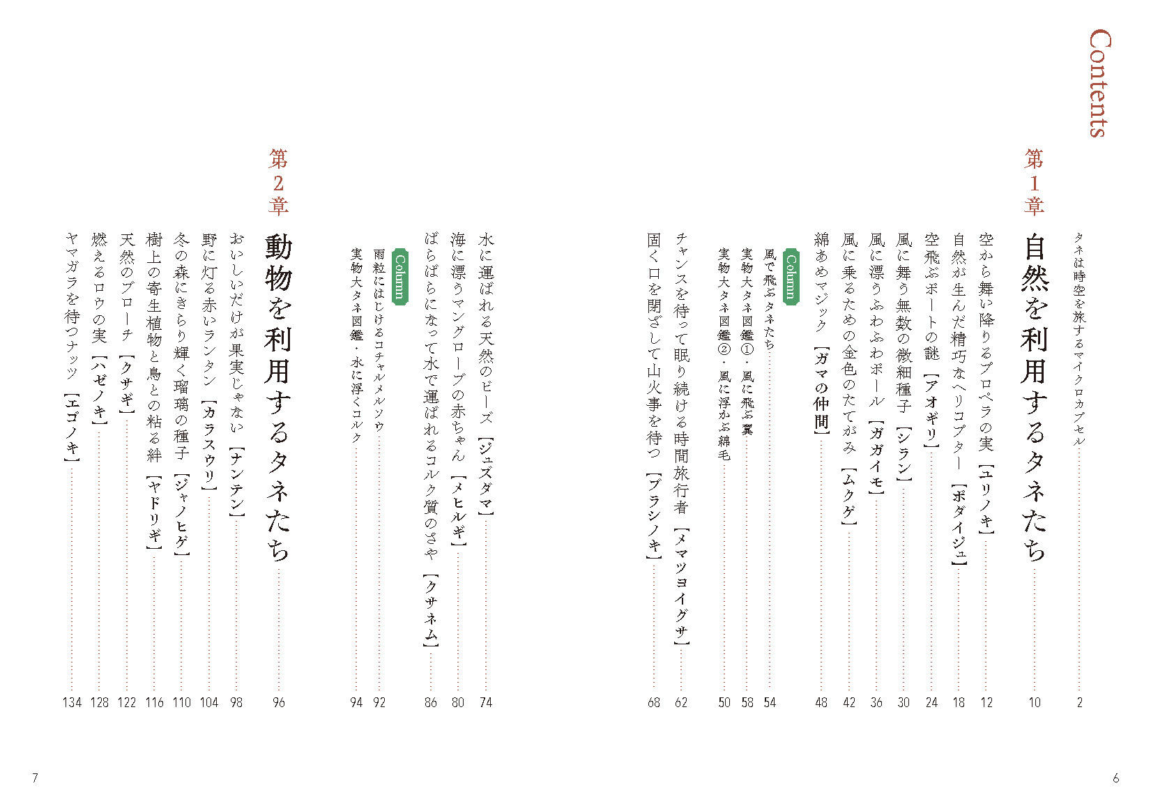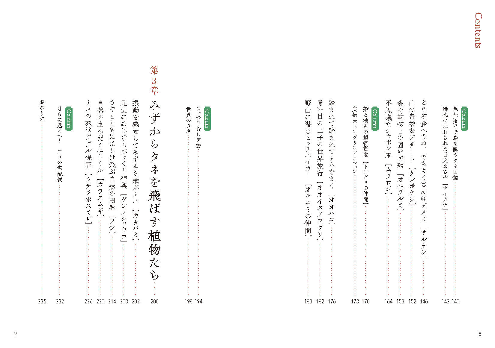 この本では、身近な植物のタネがもつ、知られざる子孫を残すための工夫、巧みな旅のしかたをご案内します。