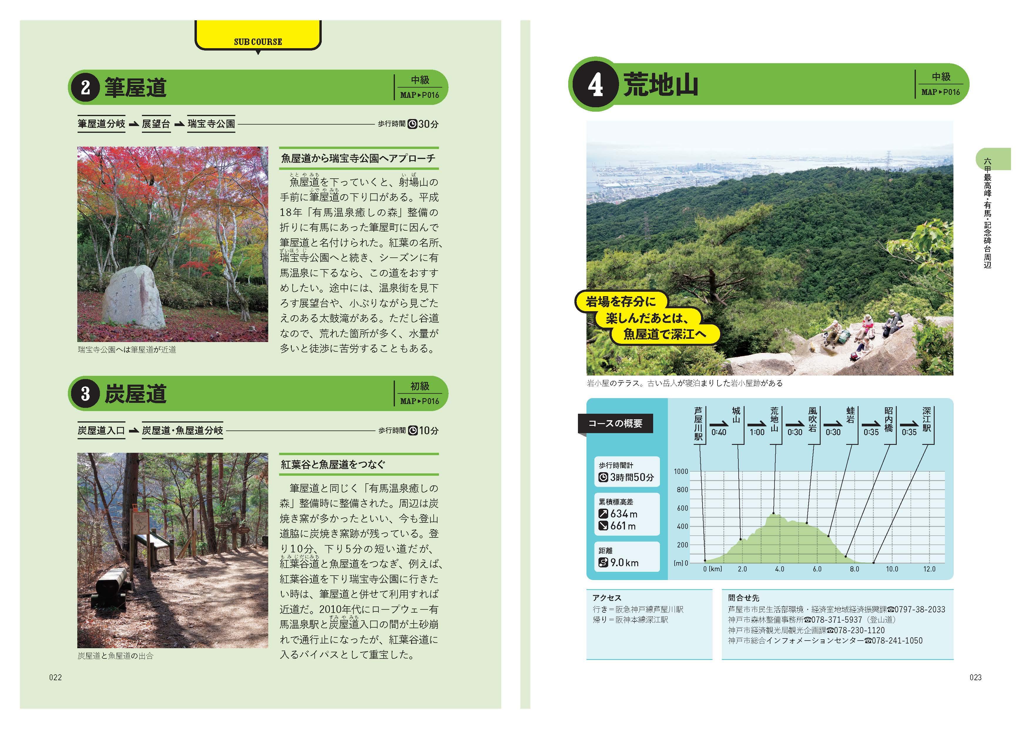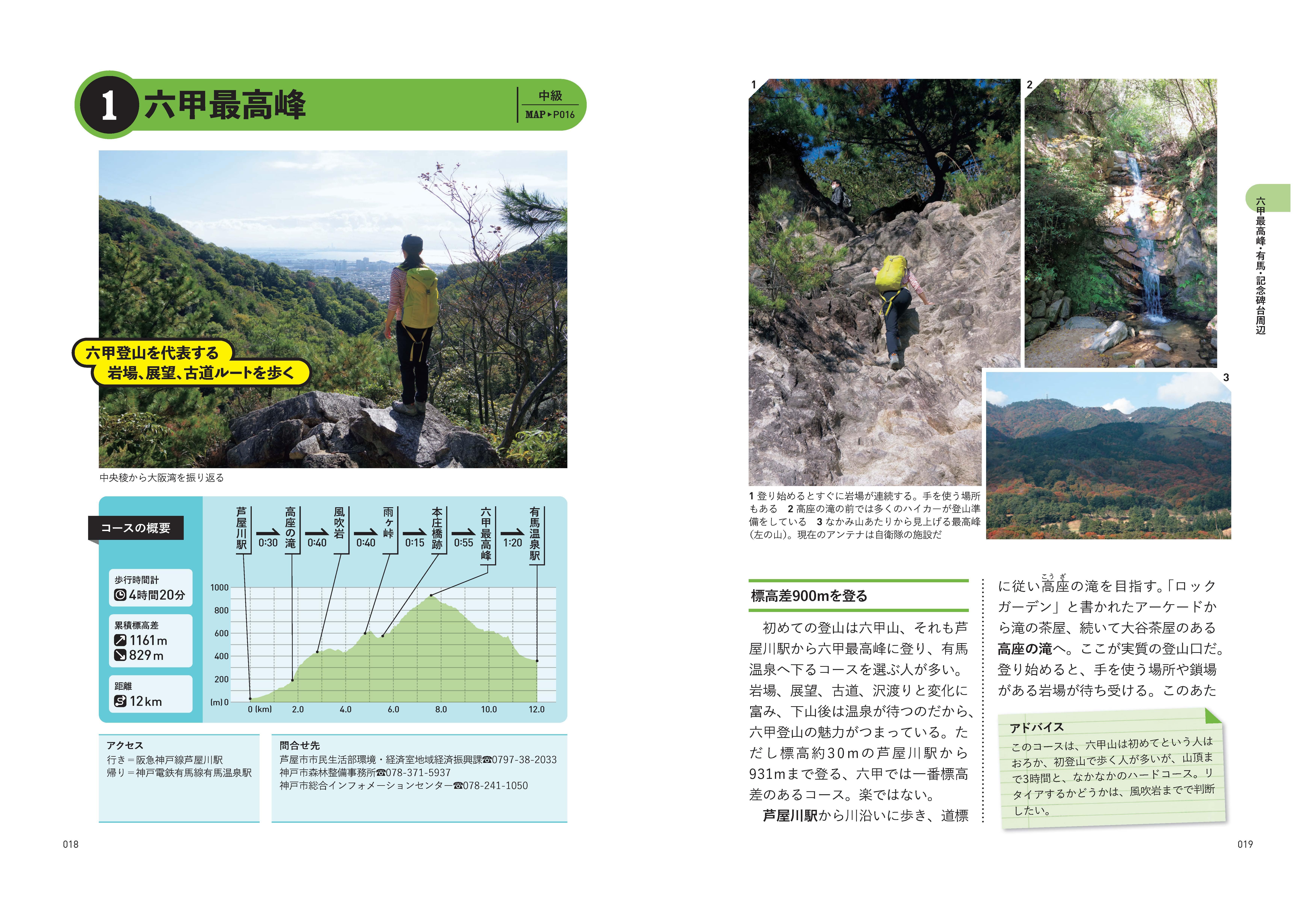 1六甲最高峰、2筆屋道、3炭屋道、4荒地山、5道畦谷北尾根、6東お多福山、7芦屋ロックガーデン、8石切道・紅葉谷道、9住吉道、10番匠屋畑尾根、11七兵衛山・打越山、12有馬四十八滝、13白石谷、14有馬三山、15船坂谷、16蛇谷北山、17鬼ヶ島・逢ヶ山、18アイスロード・シュラインロード、19大池地獄谷、20石楠花谷、21地獄谷西尾根、22六甲アルプス、23古寺山、24天狗岩南尾根・油コブシ、25長峰山、26山羊戸渡、27六甲山上めぐり