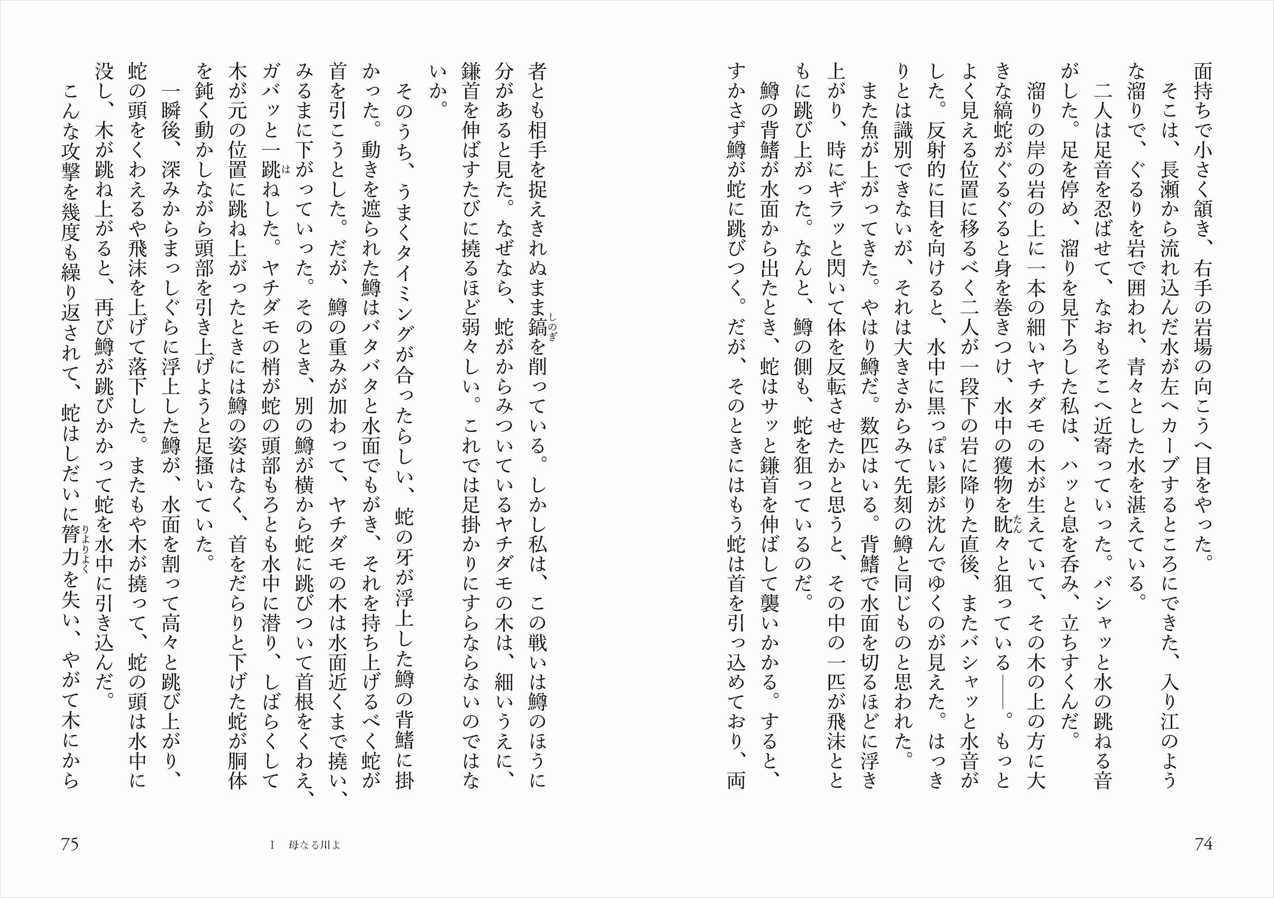 「激しさと穏やかさが、さも当然といった風に共存する山の姿を垣間見て、私は心の殻がはがれて、それが剝き出しになるような戦慄(おののき)を感じていた。川の流ればかりではない。ここでは、魚も獣も人も、死と背中合わせに生きている。ちょっとした油断、そして恐らくは抗いようのない偶然が、それらの生を死へとすり替えてしまうのだ。」(本文より)