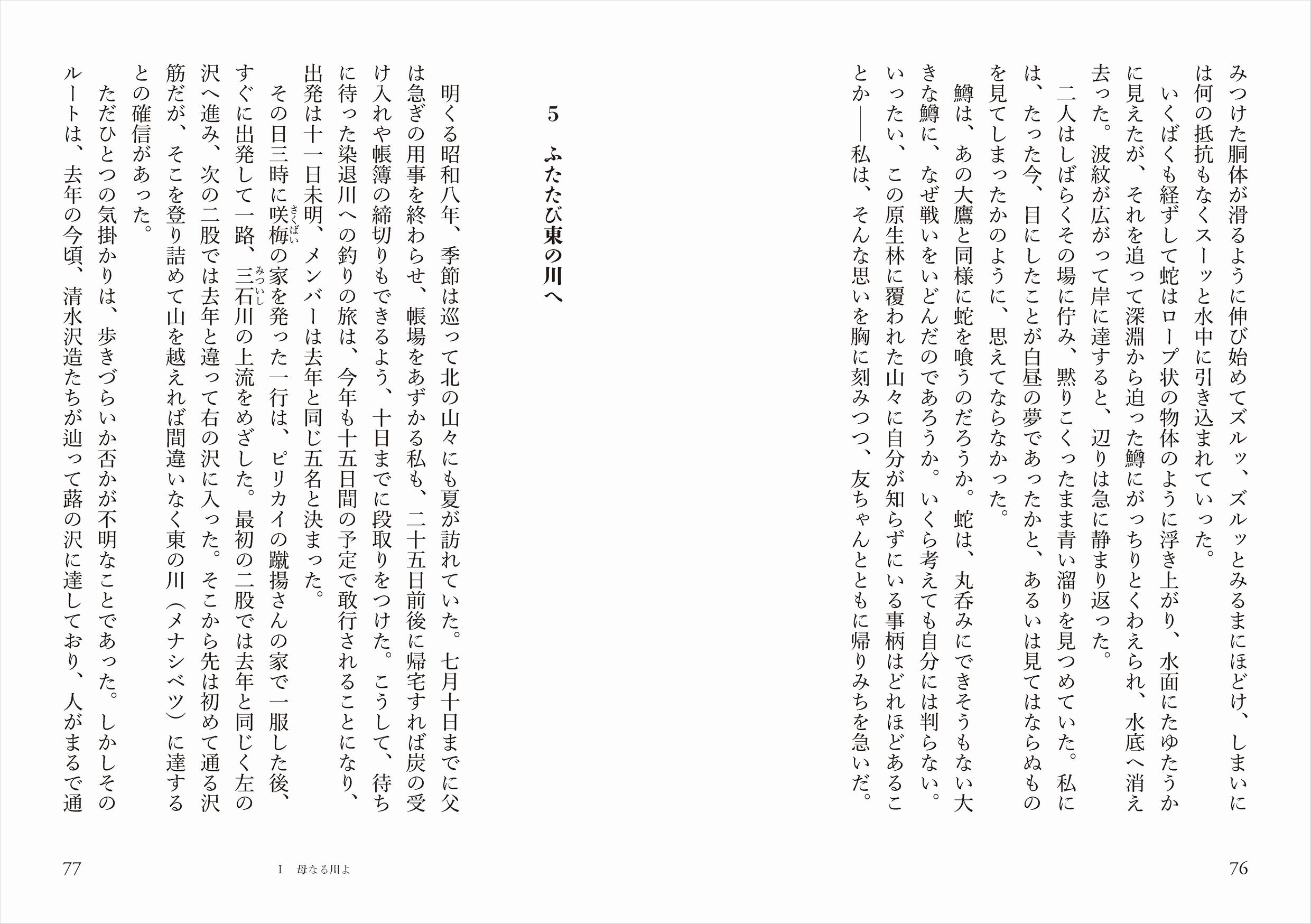 1 母なる川よ 染退川へ/無言の教え/行く人、来る人/自然の戦い/ふたたび東の川へ/鱒の群れ/大きなヤマベ/ペンケホカイ/大水/迷い人