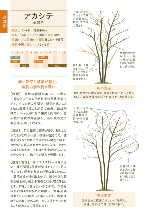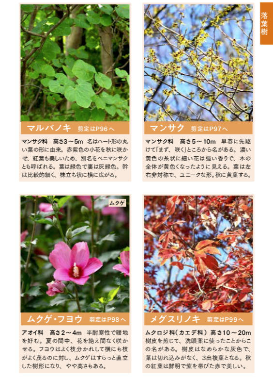 ひとつひとつの木の特徴やクセをよく捉えたシルエットイラストに、引出し線入りで切り方のコツを詳しく説明。いつ、どこをどう切ればよいのかが、一目でわかります。