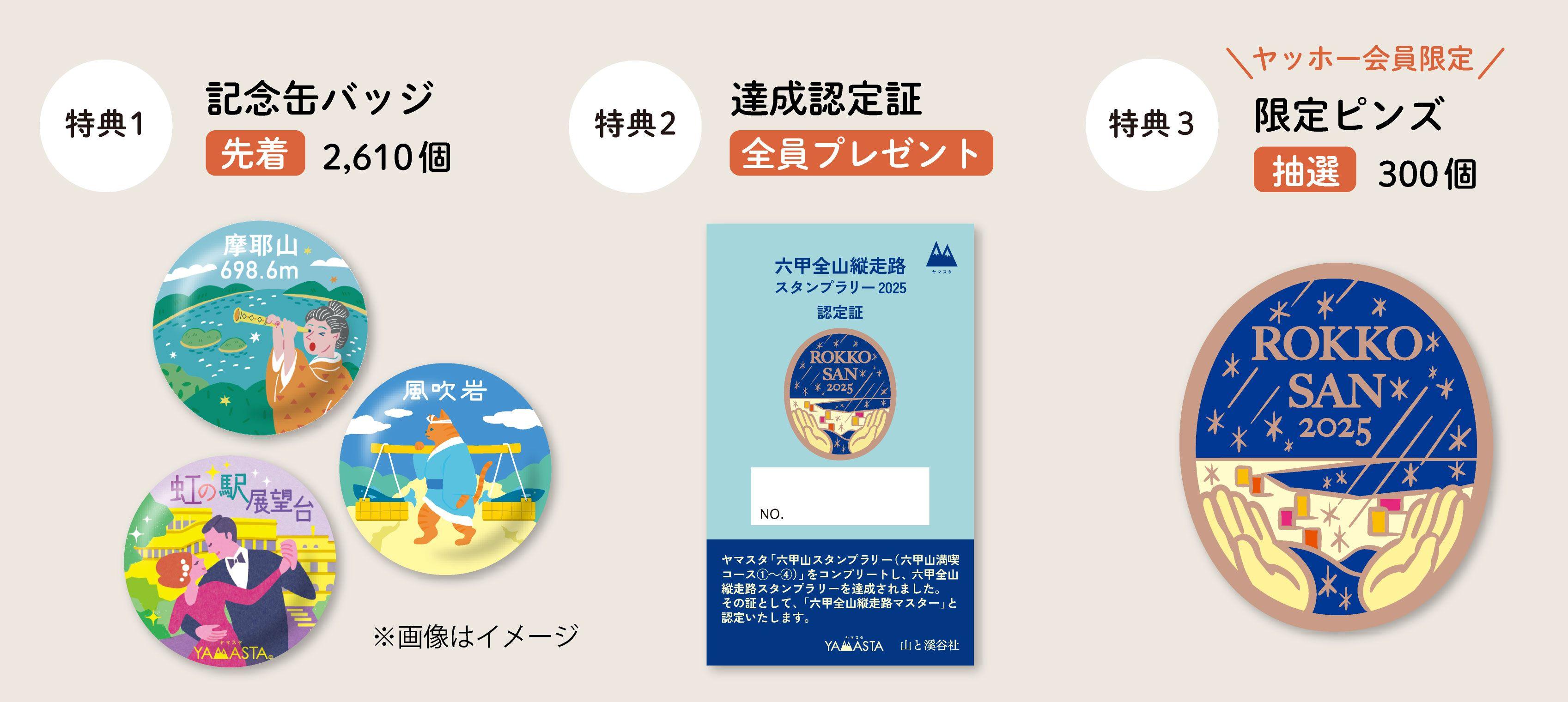 各コースを達成すると「記念缶バッジ」がもらえるほか、1~4の六甲山満喫コース(六甲全山縦走路)をすべて達成すると、「達成認定証」がもらえます。さらに、ヤッホー会員(有料サブスクリプション)限定特典として、抽選で300名様に「特製ピンズ」をプレゼントします。