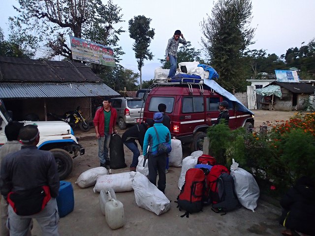 そりゃ無理でないの? と言いたくなるような暴力的荷物積載風景。この車に山盛り荷物を積んで、隊員10名が乗車して12時間のドライブとなった